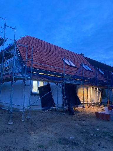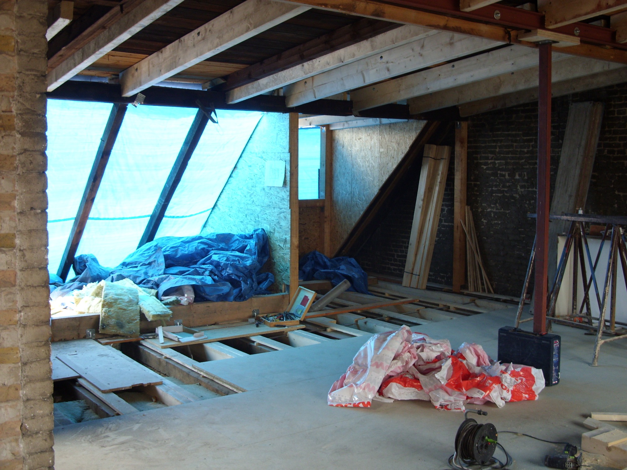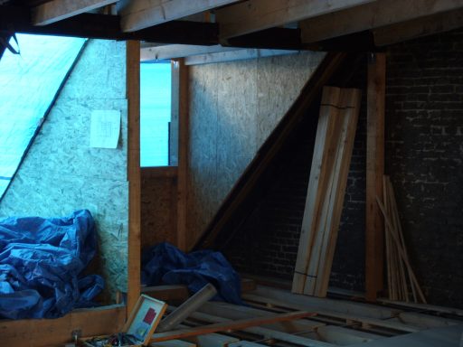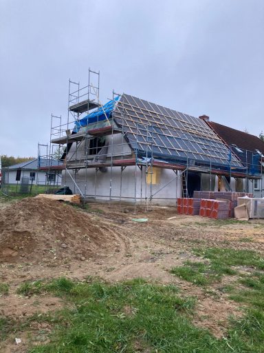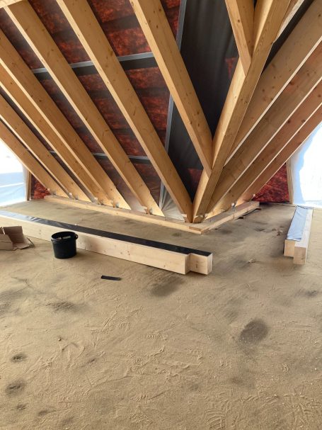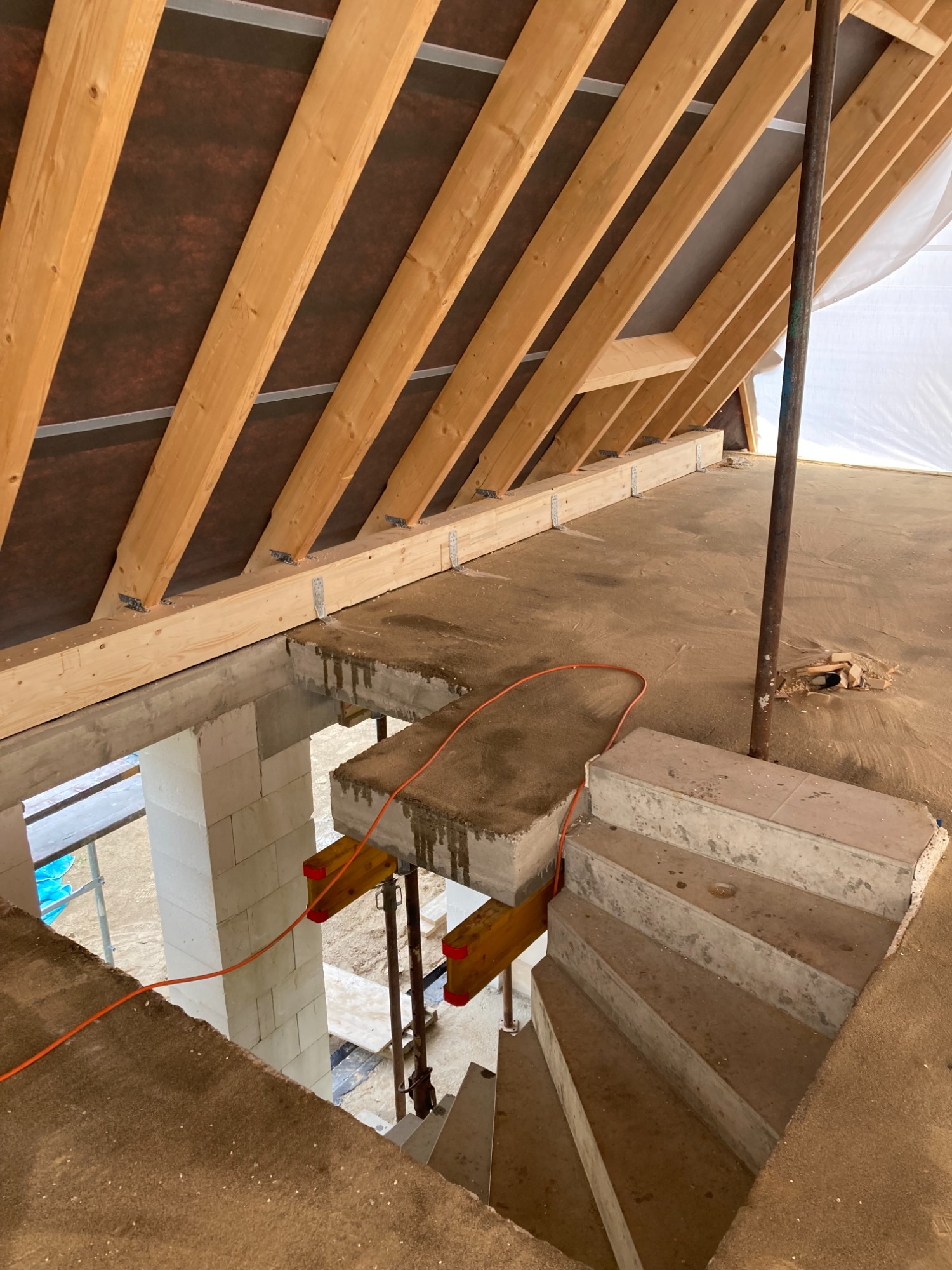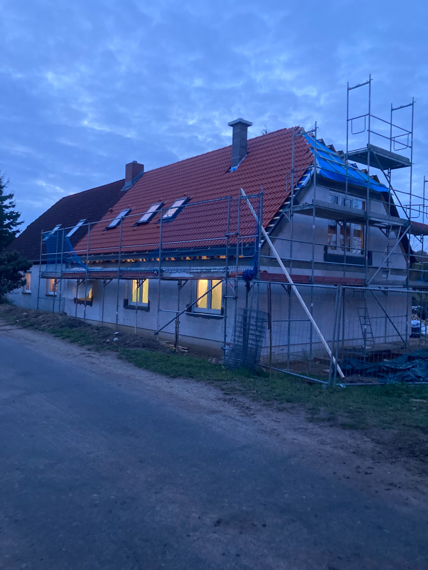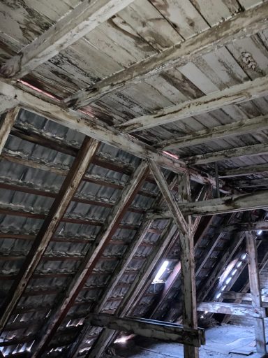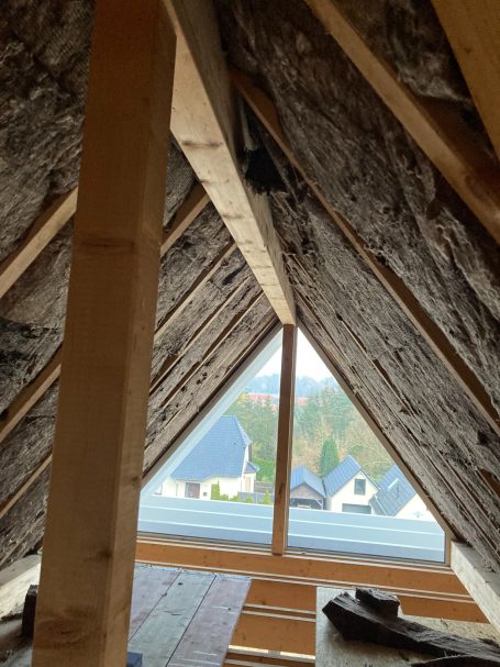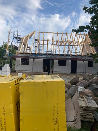 Von der Übernahme der Aufgabe bis zur Fertigstellung haben wir das Dach angehoben, Pfetten, Sparren und Stiele getauscht und gesichert, Dach eingedeckt, von innen gedämmt und mit Trockenbau versehen.