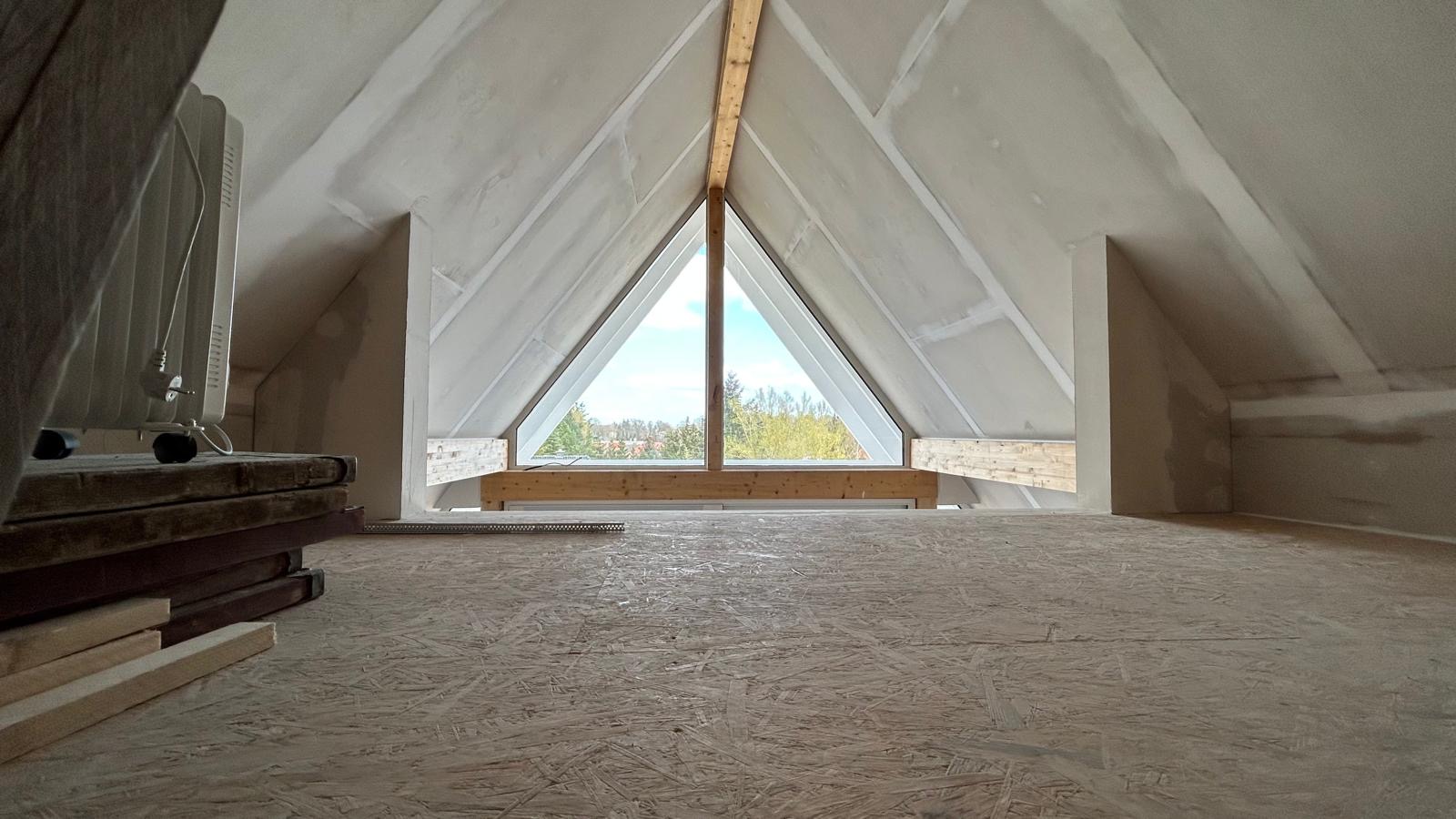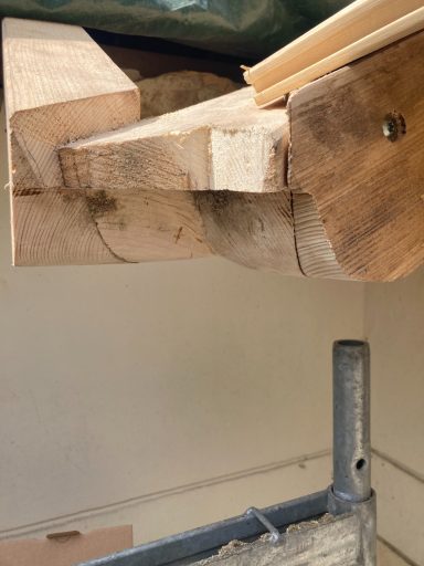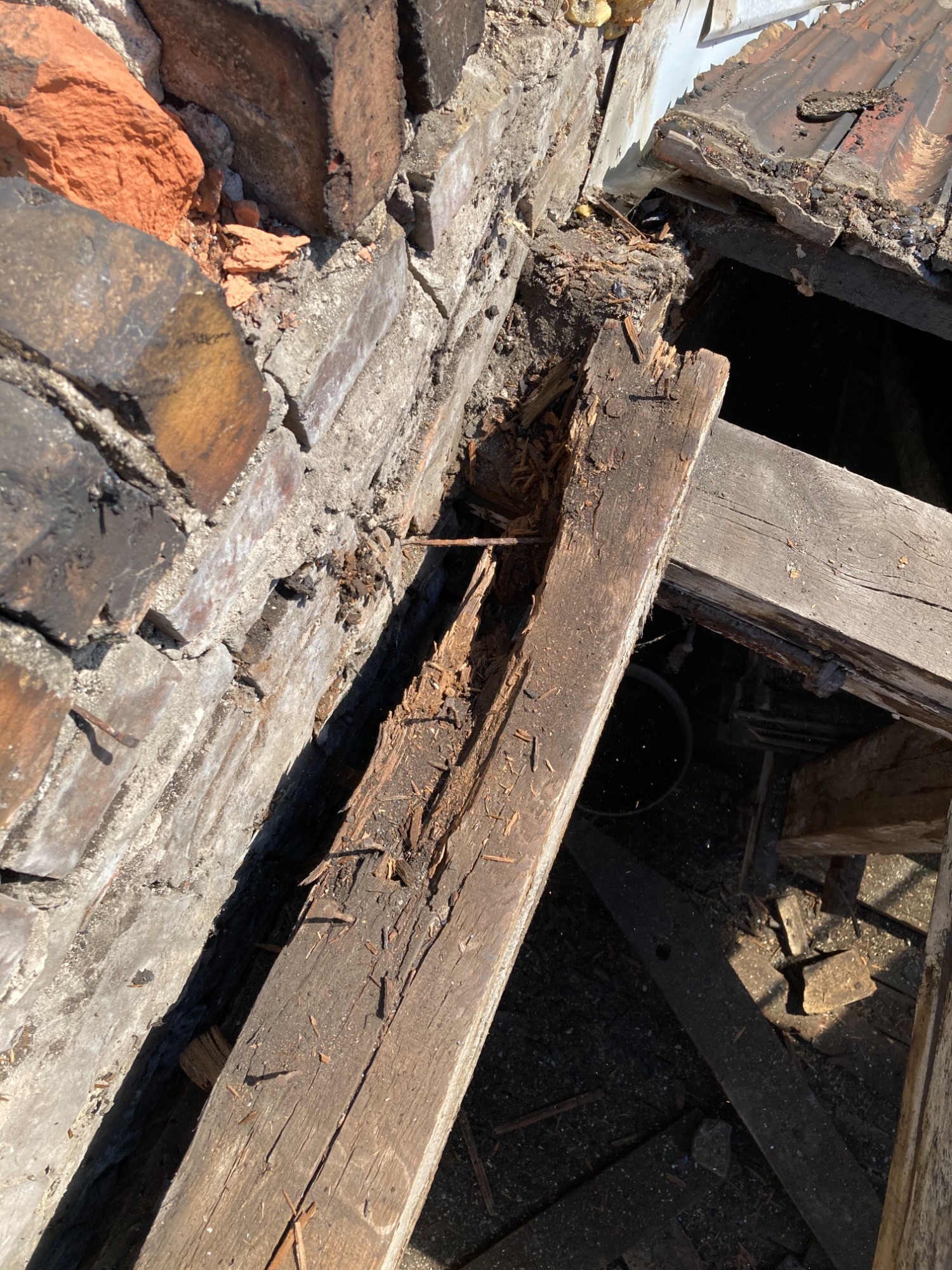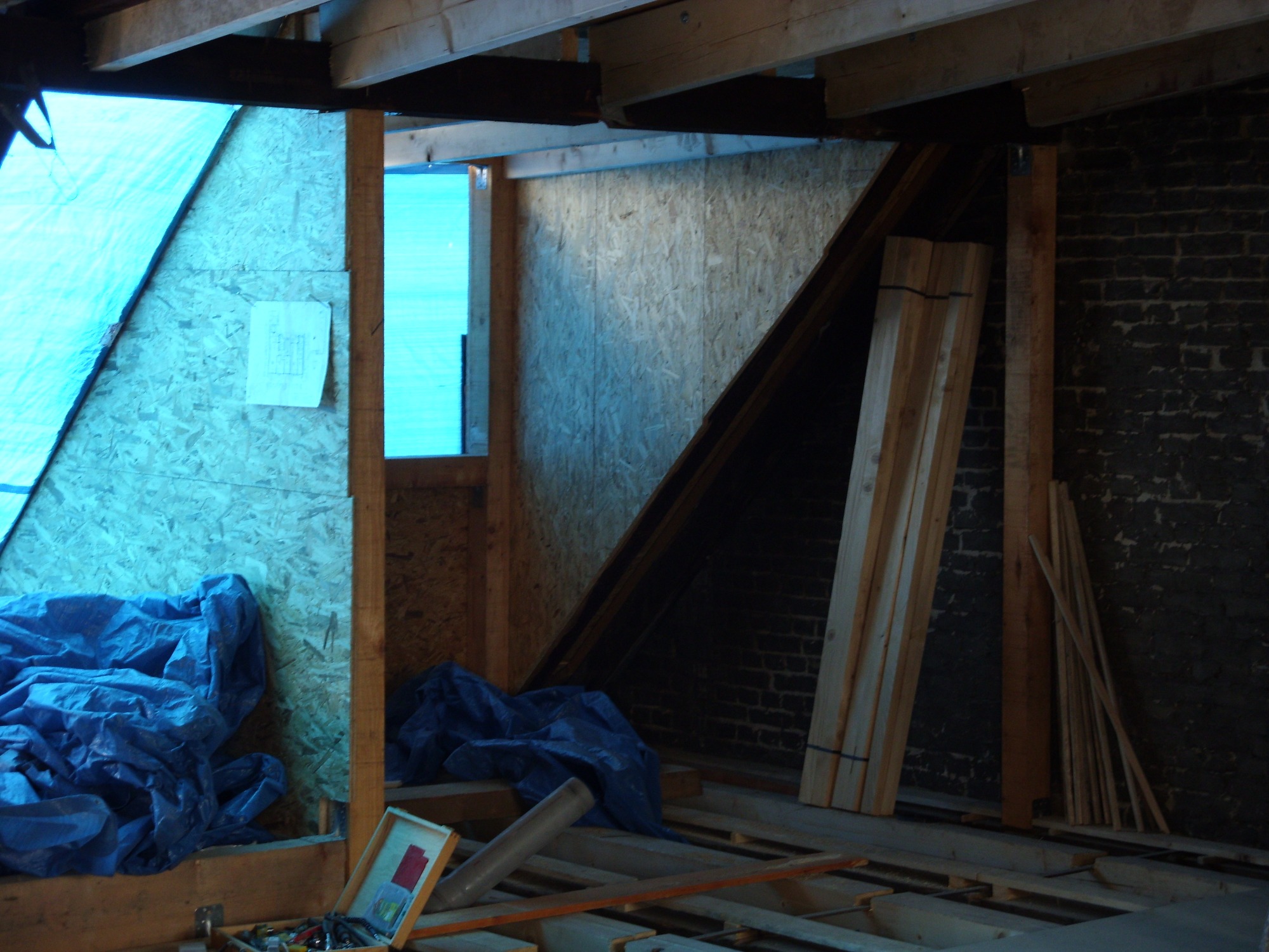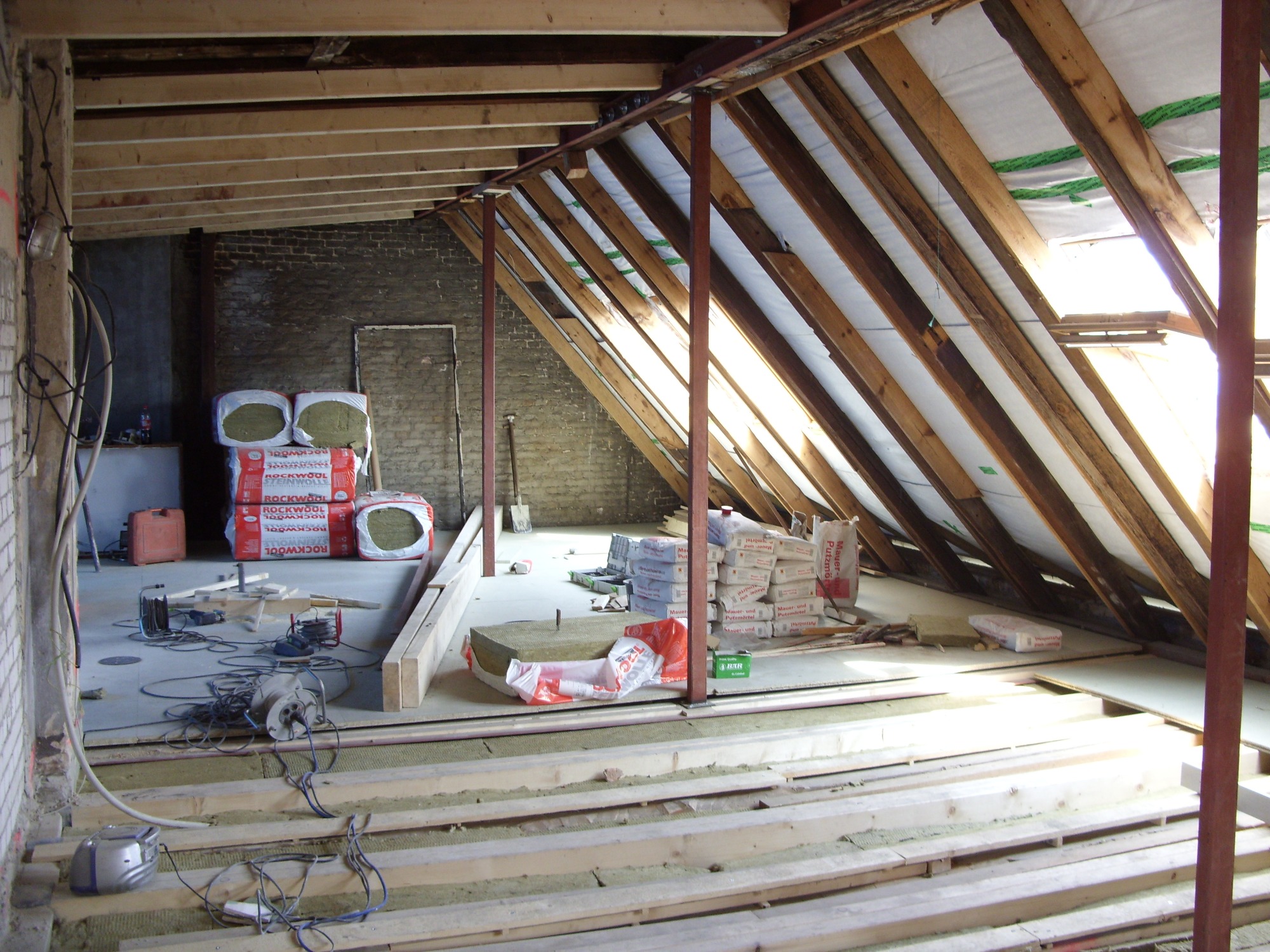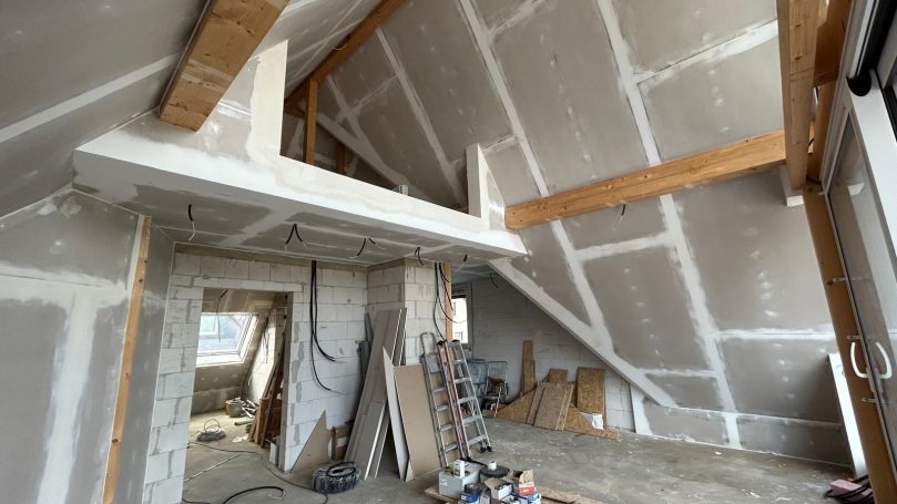 Von der Übernahme der Aufgabe bis zur Fertigstellung haben wir das Dach angehoben, Pfetten, Sparren und Stiele getauscht und gesichert, Dach eingedeckt, von innen gedämmt und mit Trockenbau versehen.