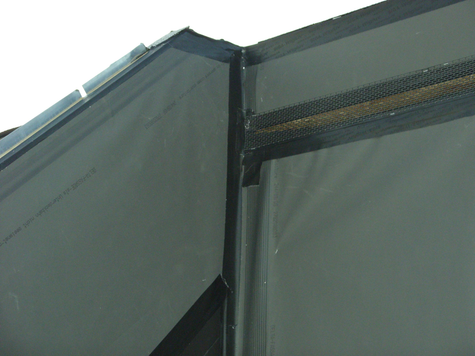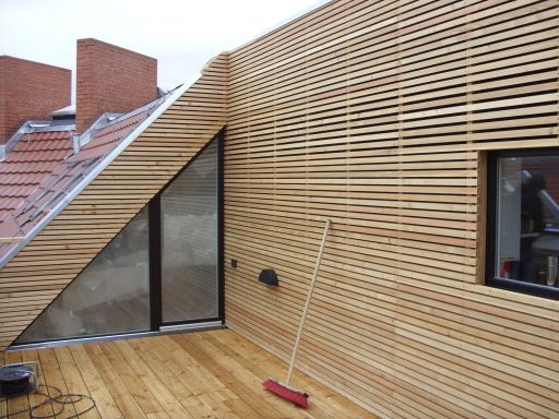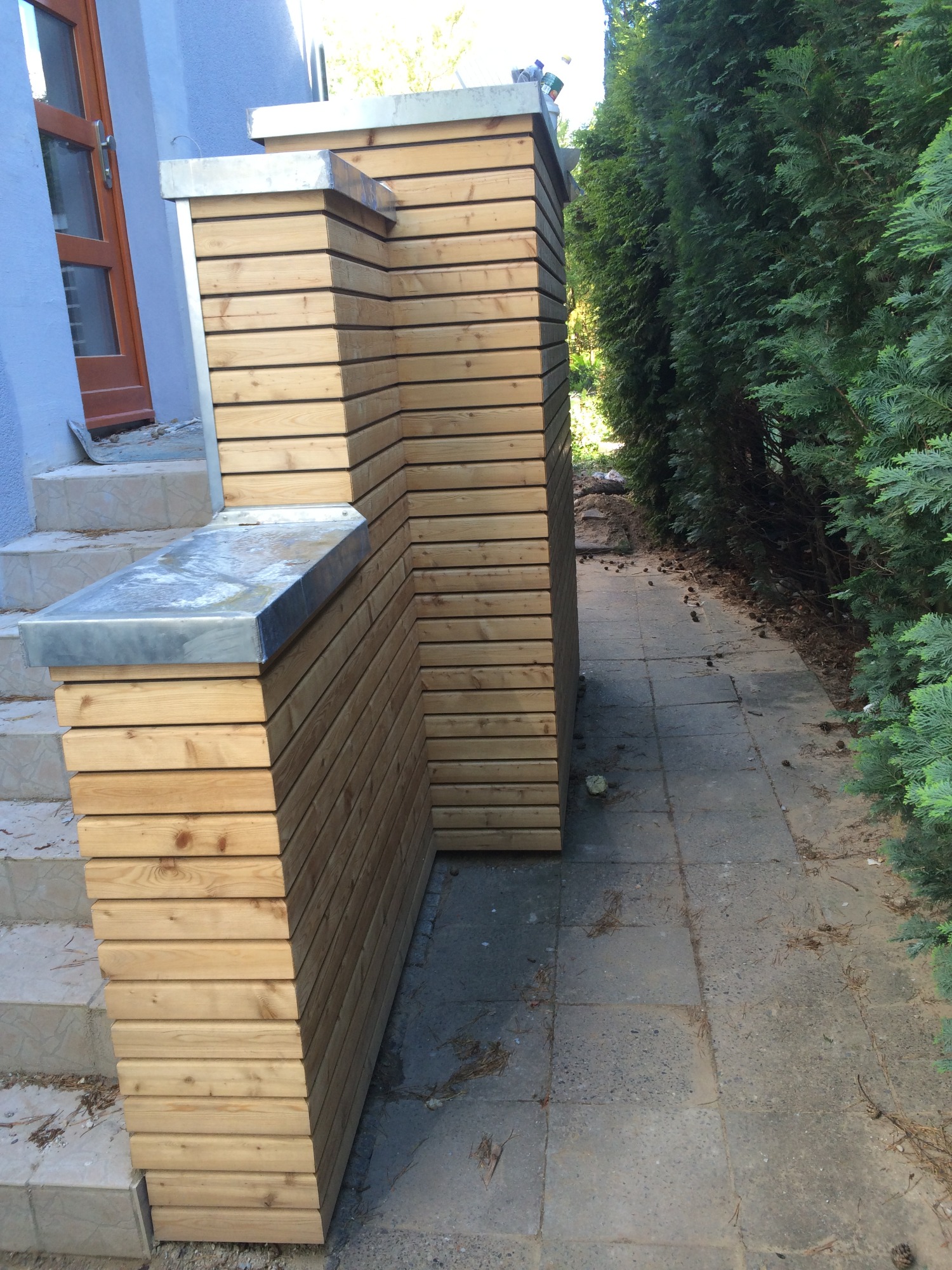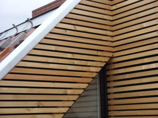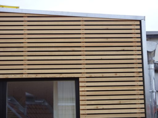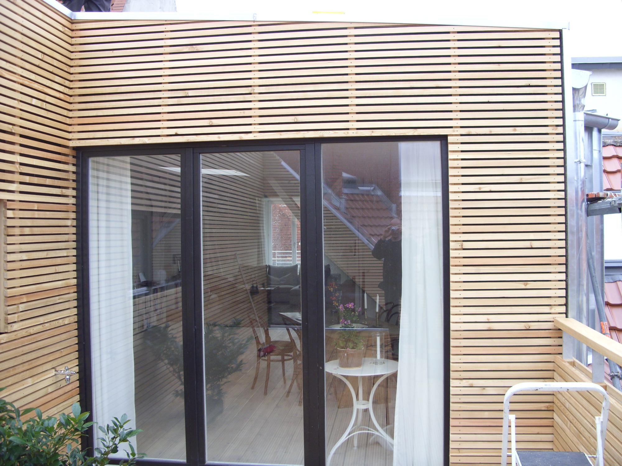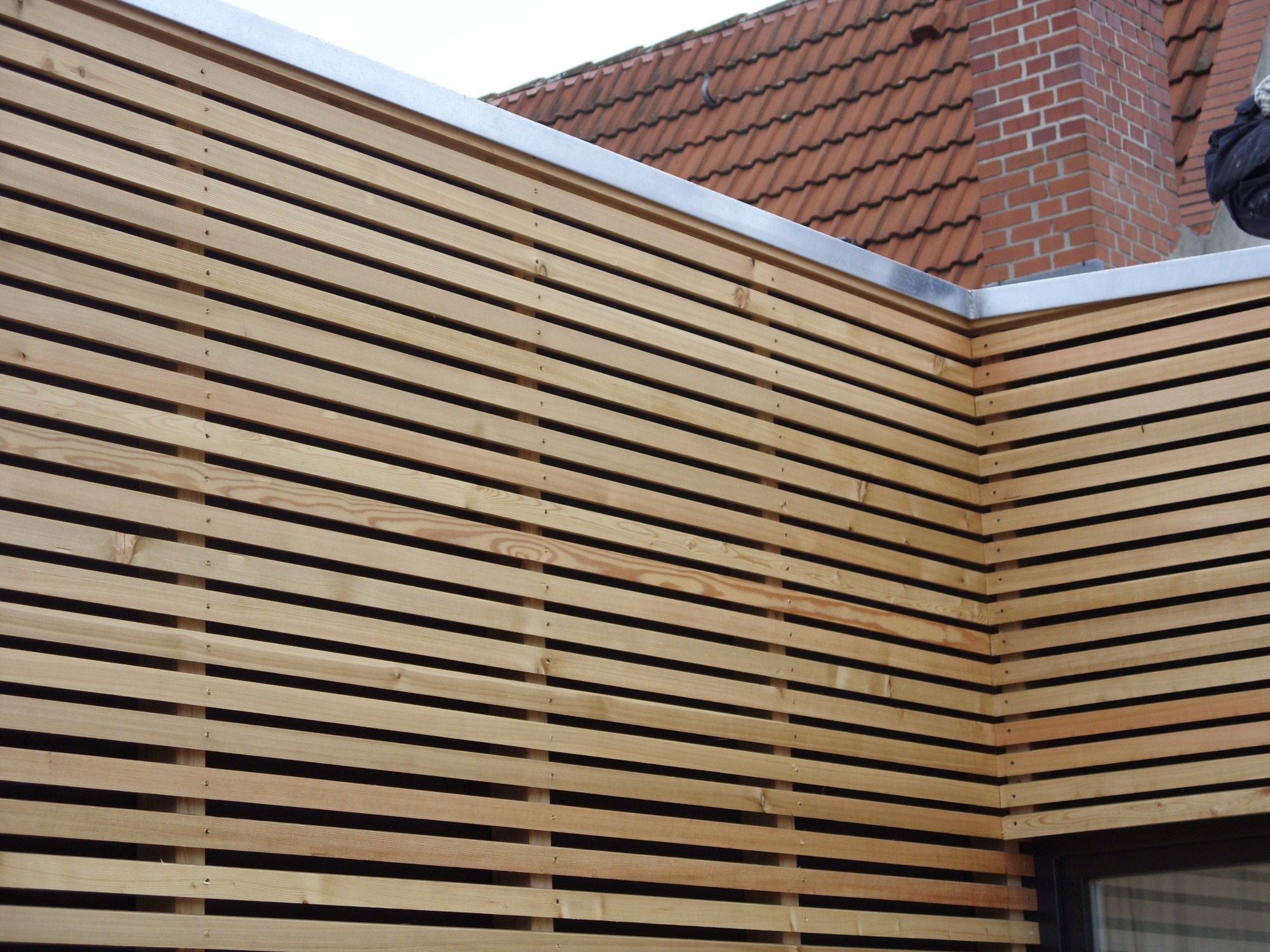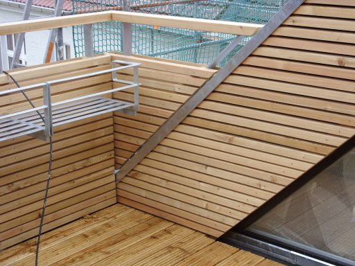 Hier wurde uns seitens des Architekten die Gestaltung frei gelassen. In Absprache und erstellter Skizzen wurde dann die Ausführung freigegeben. Unterkonstruktion und Unterspannbahn in Schwarz mit Lärchenholz-Trapezprofil.