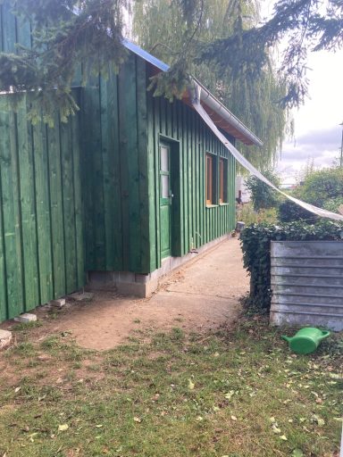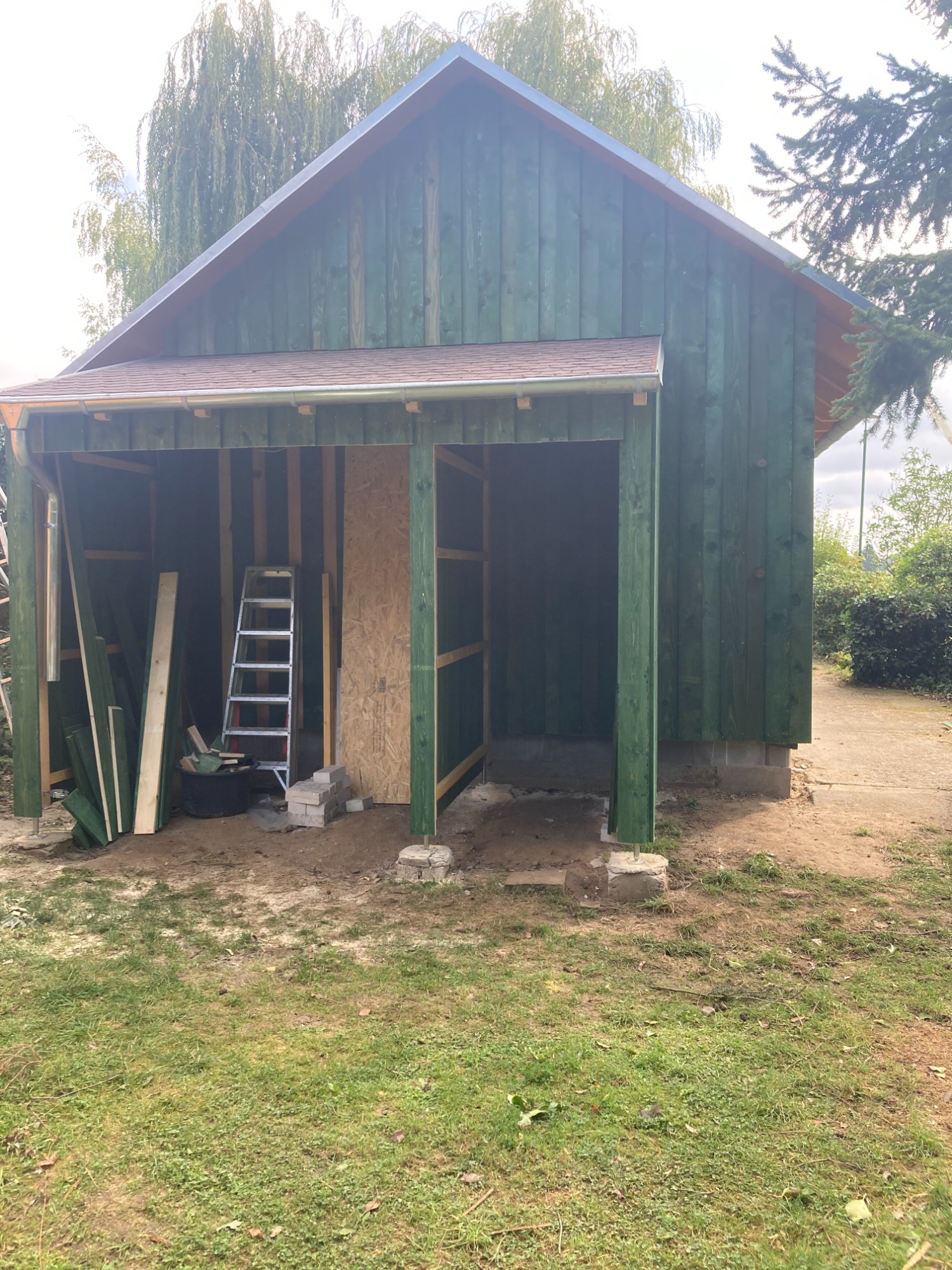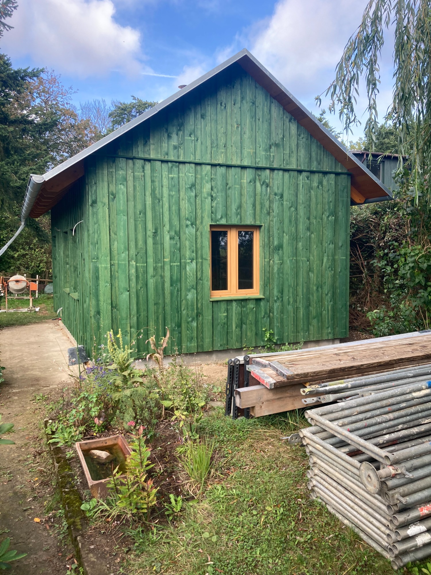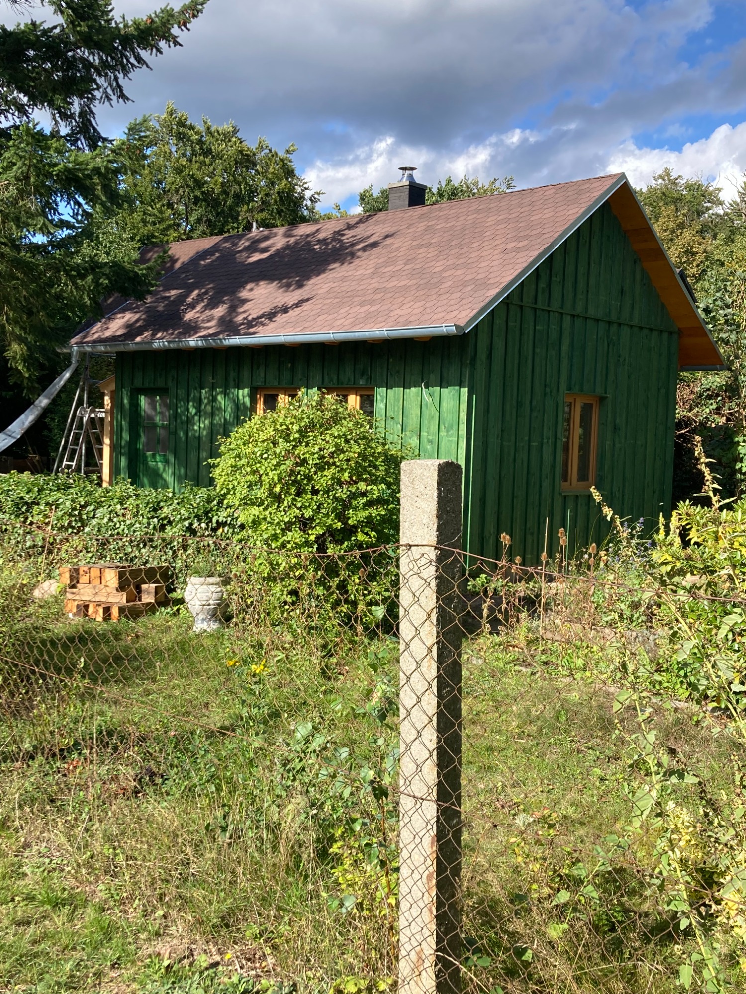 Hier schlossen wir die Schalung im Dachbereich, dichten dies mit Bitumenbahn ein und legten eine Biberschwanzähnliche Bitumendachschindel auf. Die Wände wurden dann alle gedämmt und mit einer Fassadenverkleidung aus horizontaler Stülpschalung versehen. Türen und Fenster wurden entsprechend dem Stand der Technik nachgedichtet und verkleidet.