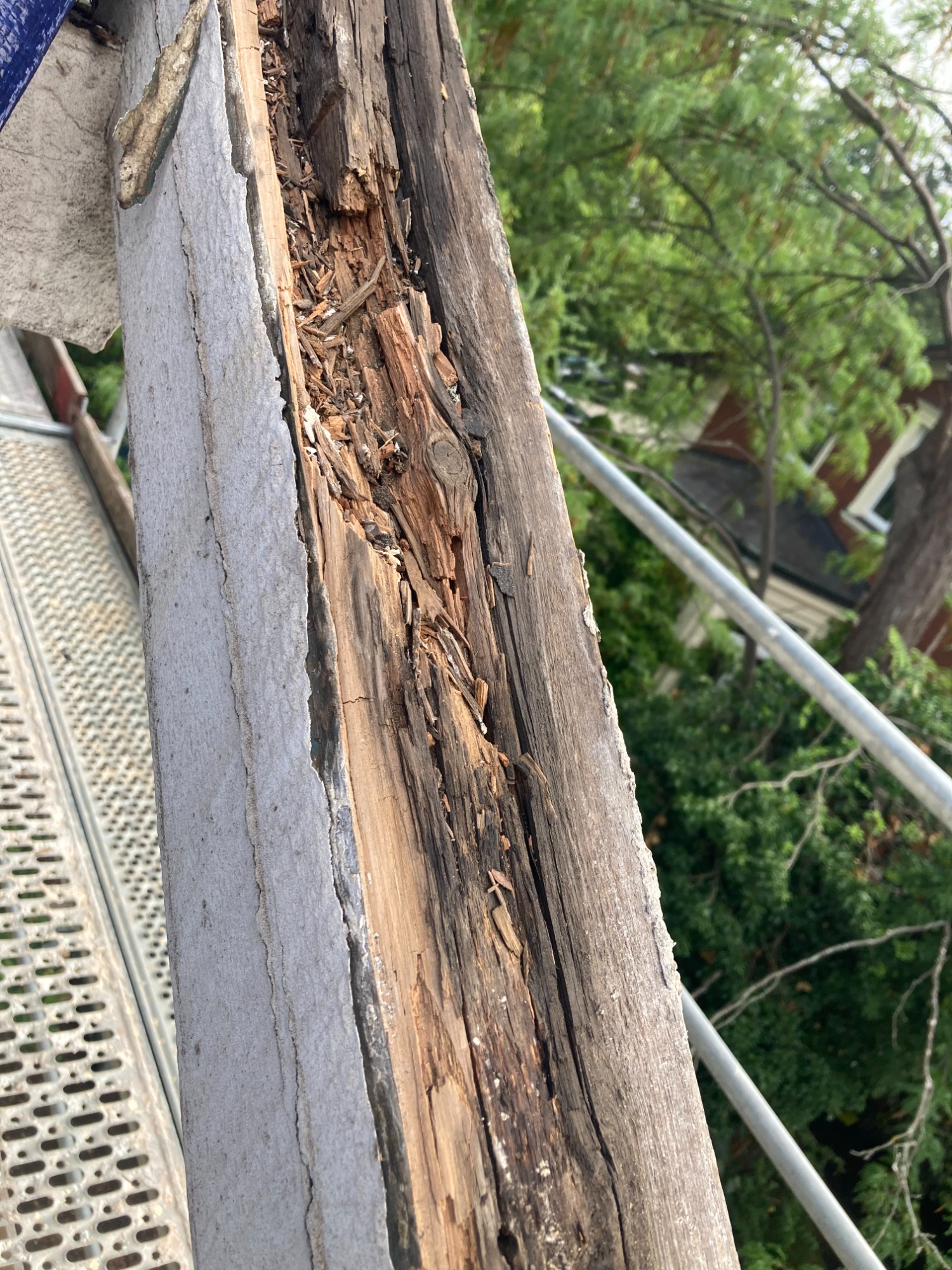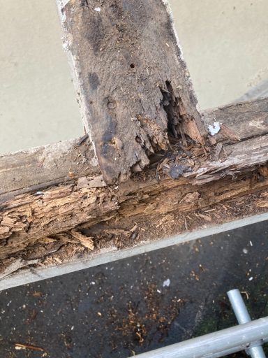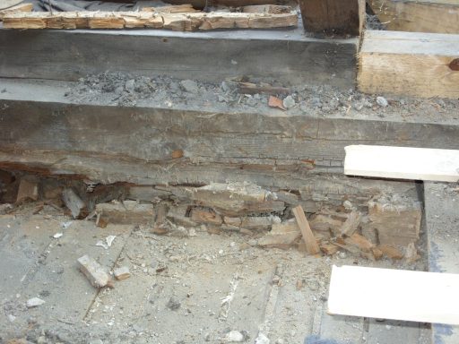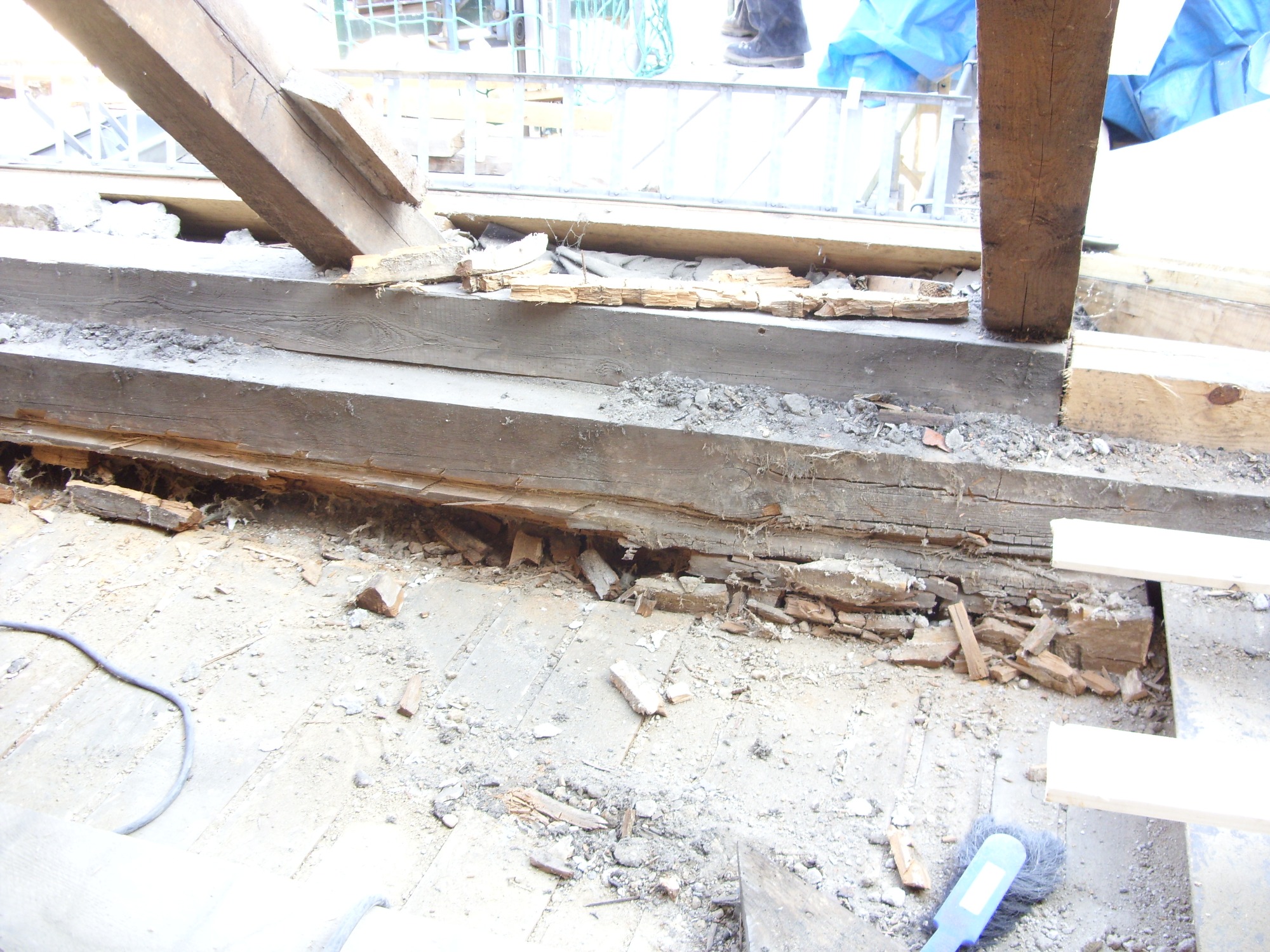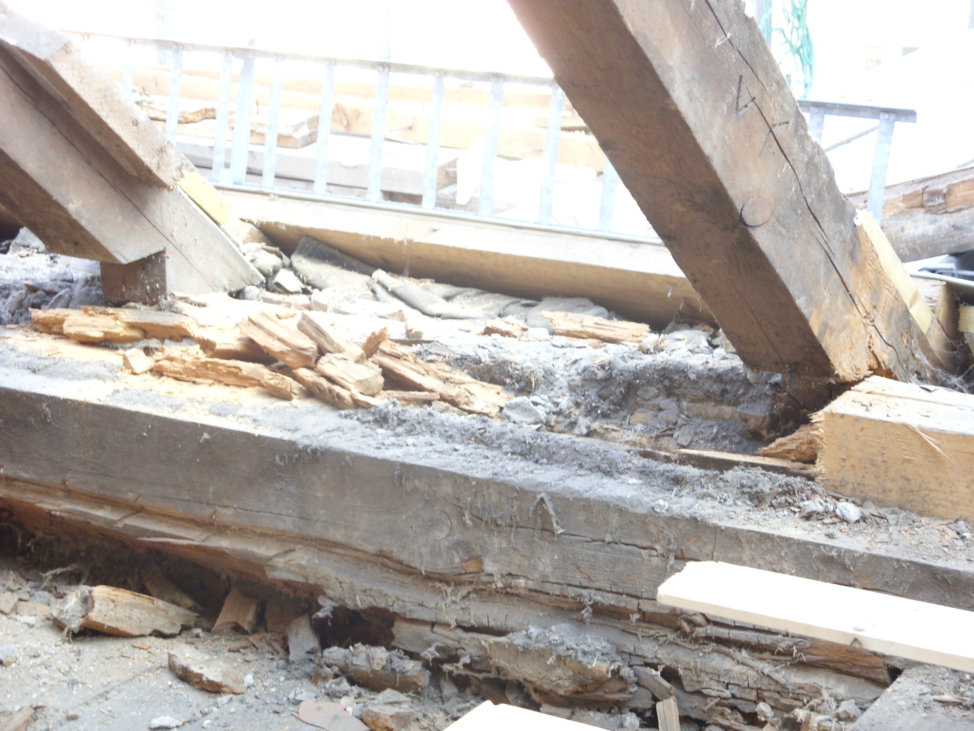 Erneuern der verrotteten Dächer, Laufanlagen und Fassadenbekleidung.