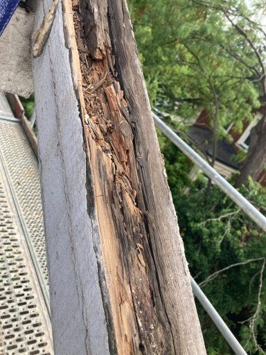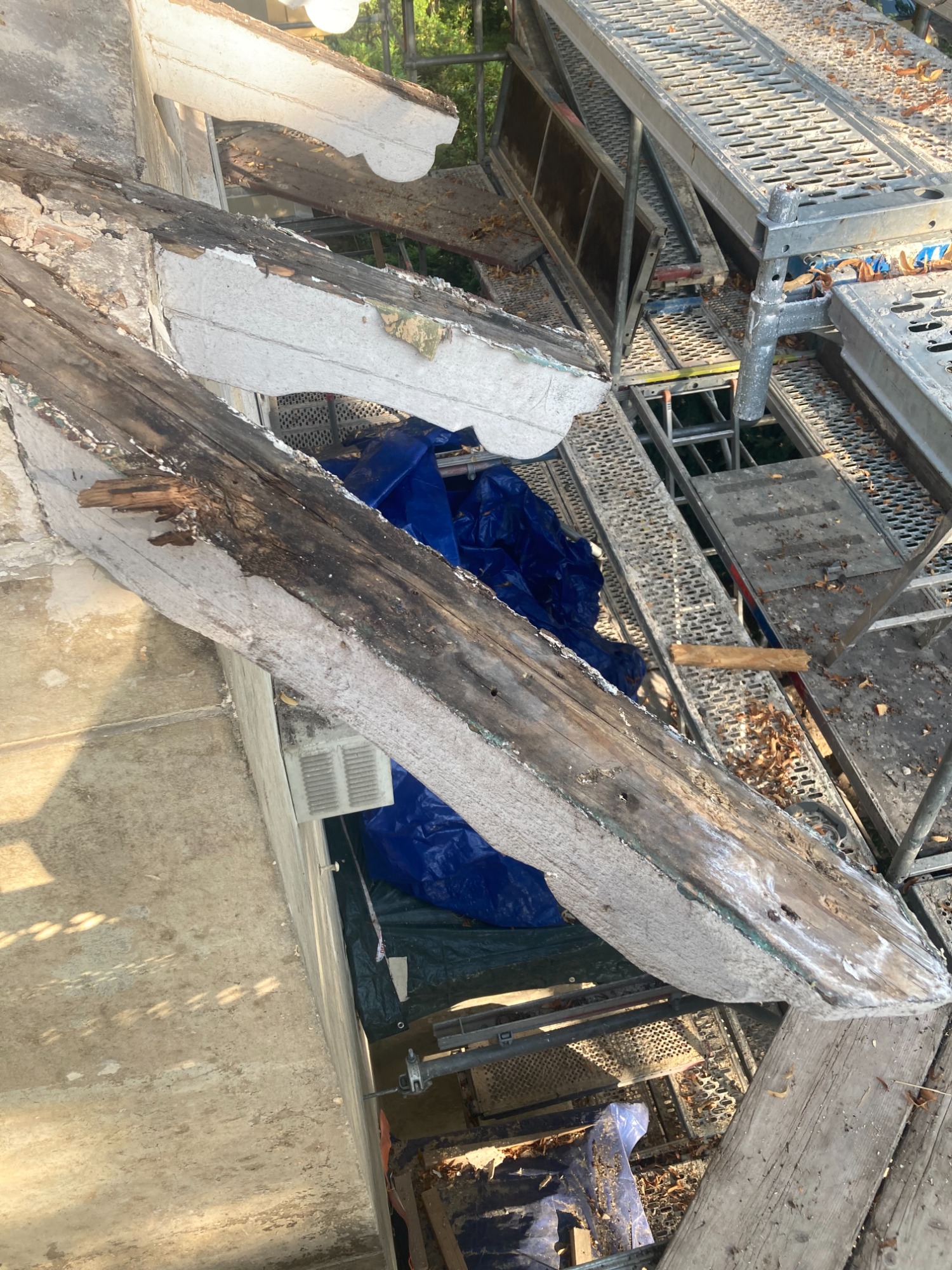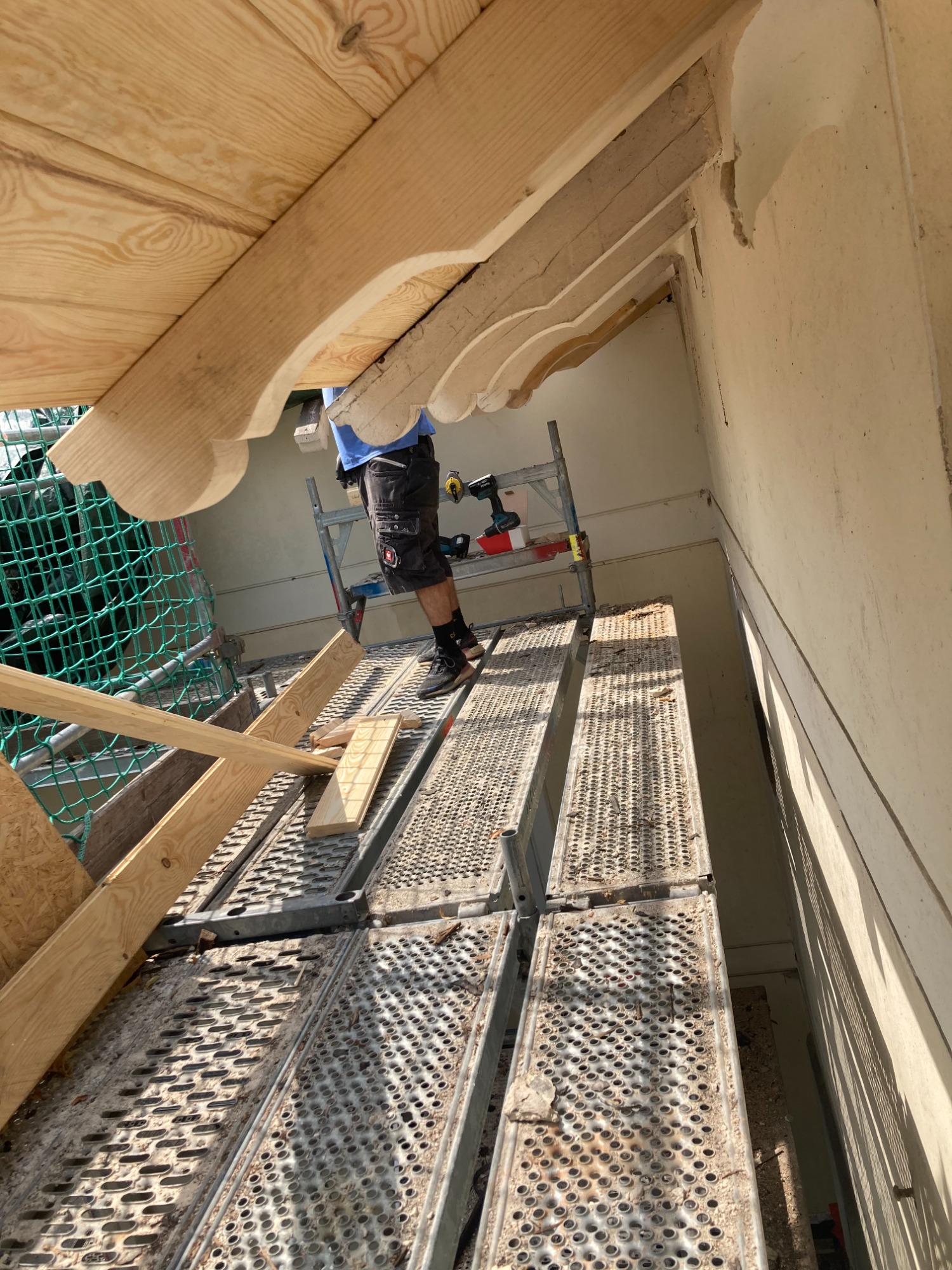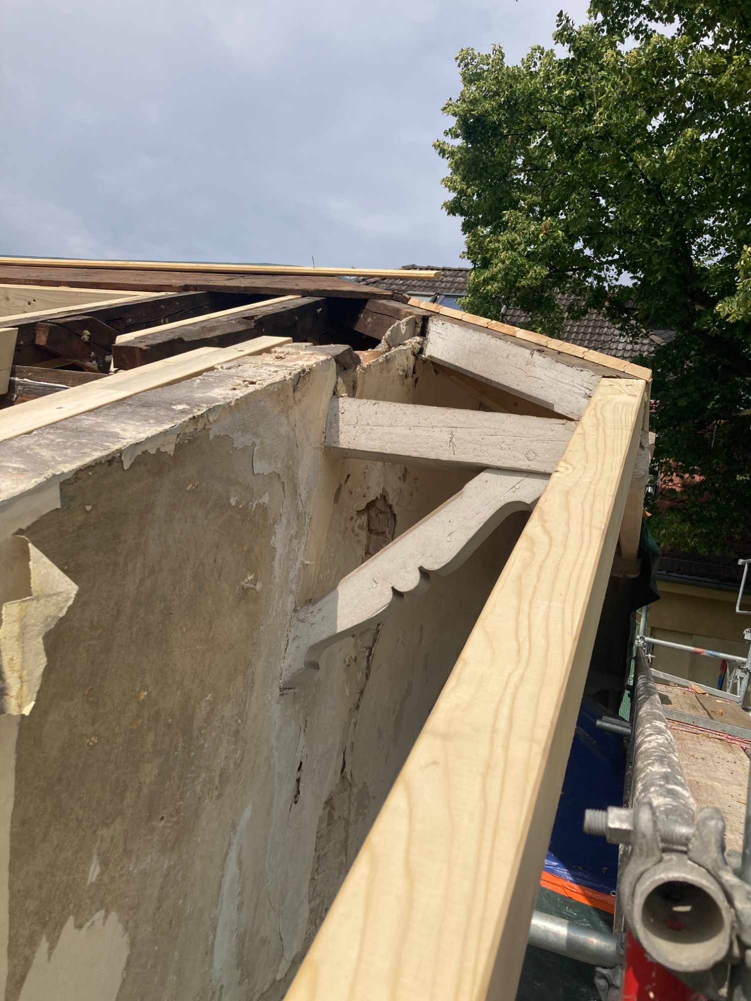 Hier haben wir an der Terrasse im Dachgeschoß die kaputten Deckenbalken komplett getauscht und Köpfe umlaufend neu profiliert. Am Hauptdach und den 3 Erkern die Sparren-, Kehl- und Gratköpfe freigelegt, Neu profiliert und an die Bestandssparren angepasst. Hinzu kam die komplette Verschalung der Dachflächen.
