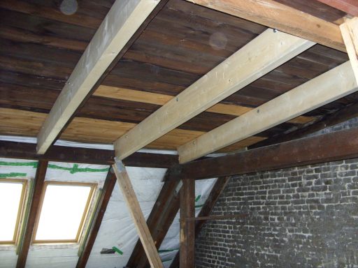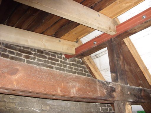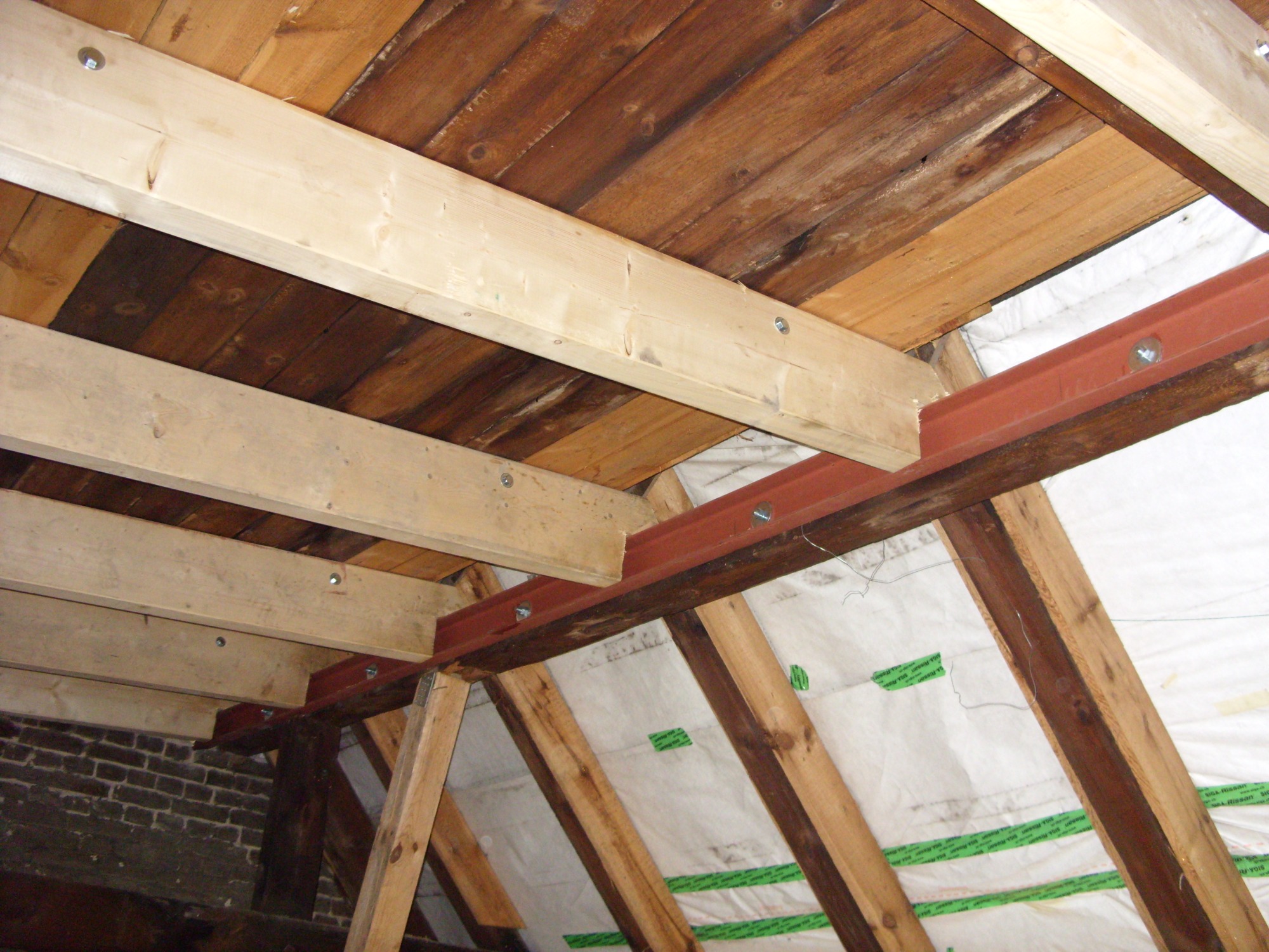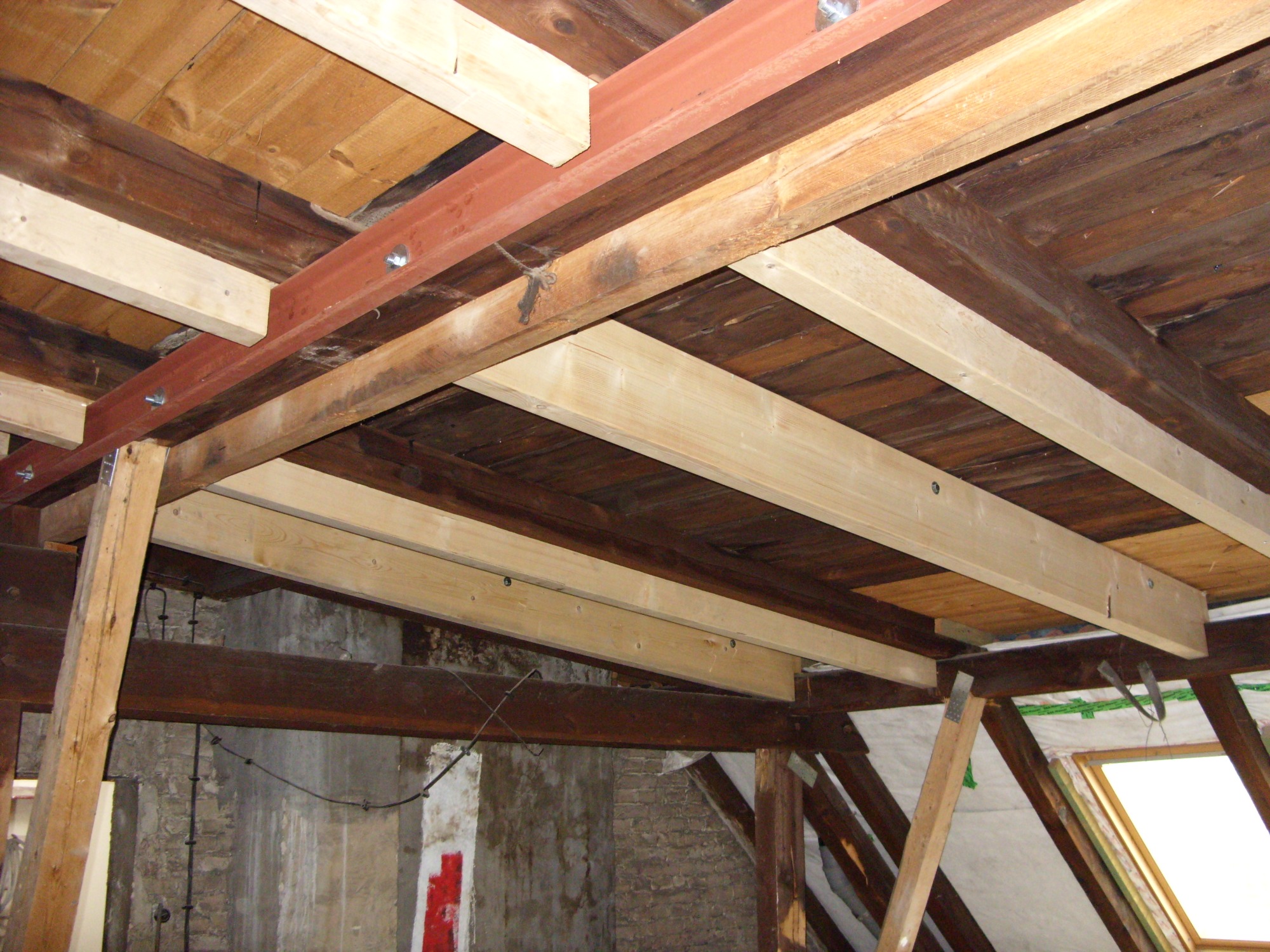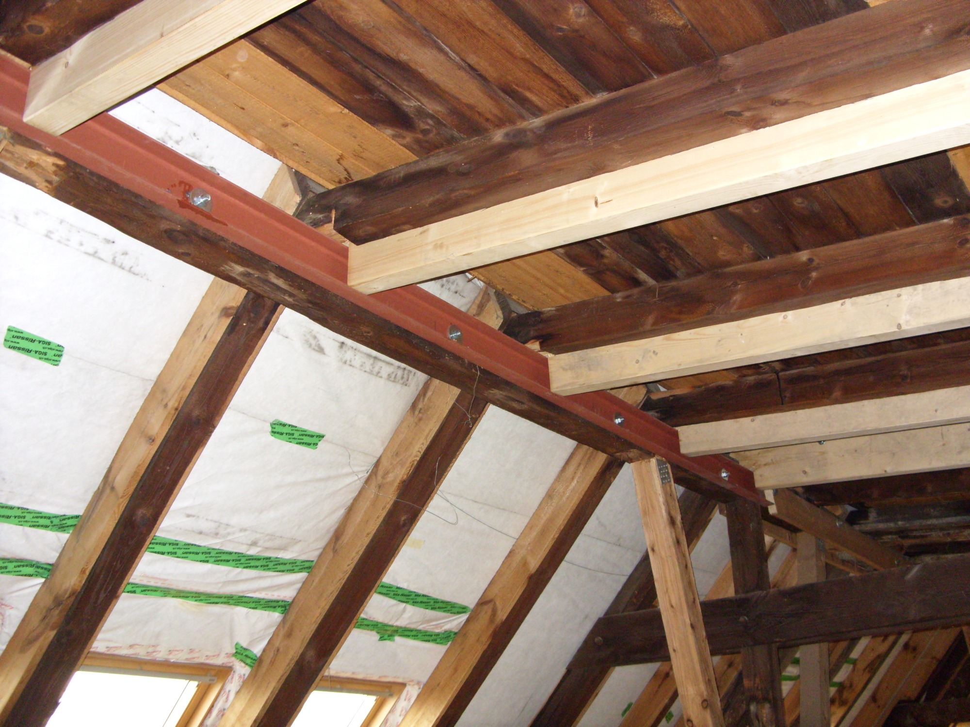Deckenbalkensanierung und Umbau des kompletten Daches nach statischen Vorgaben, unter Einsatz von Stahlverbindungen für den Großteils stützenfreien Raum