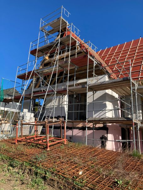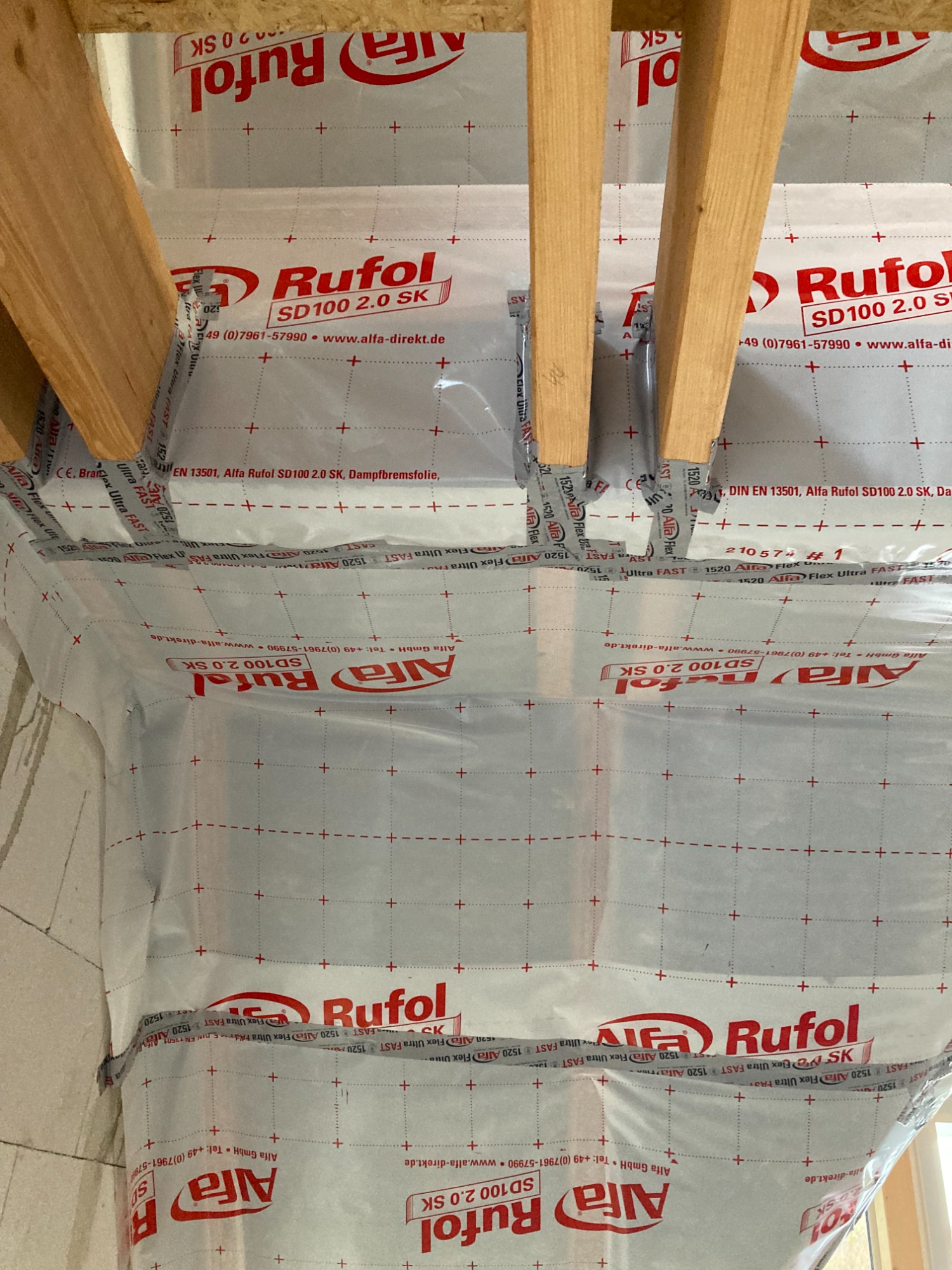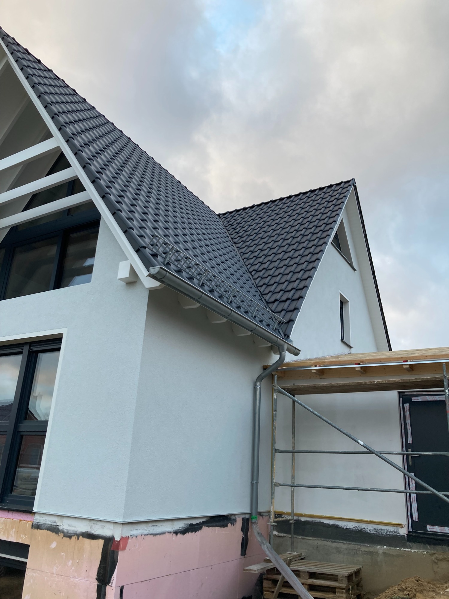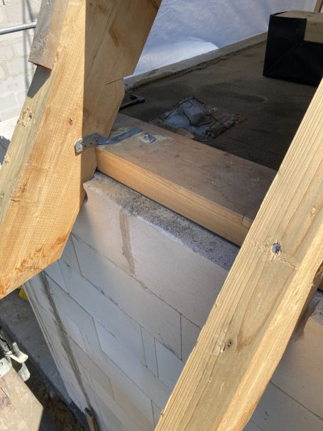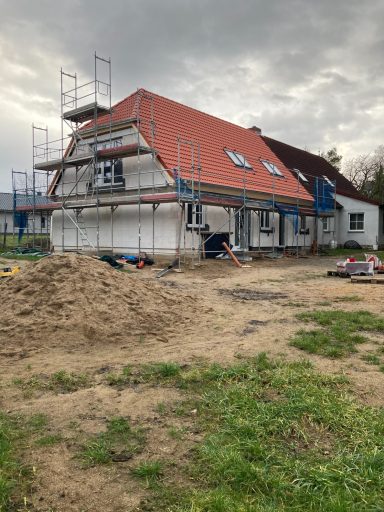 Hier haben wir den Bauherren das kleine Gartenhäuschen gerettet. Dieses befand sich bei Übernahme (nach 2-3 monatigem Stillstand) in einer Rahmenbauweise die innen bereits an den Wänden mit OSB verkleidet, das Dach war nur teils mit Schalung versehen und beschnitten an den Giebeln.