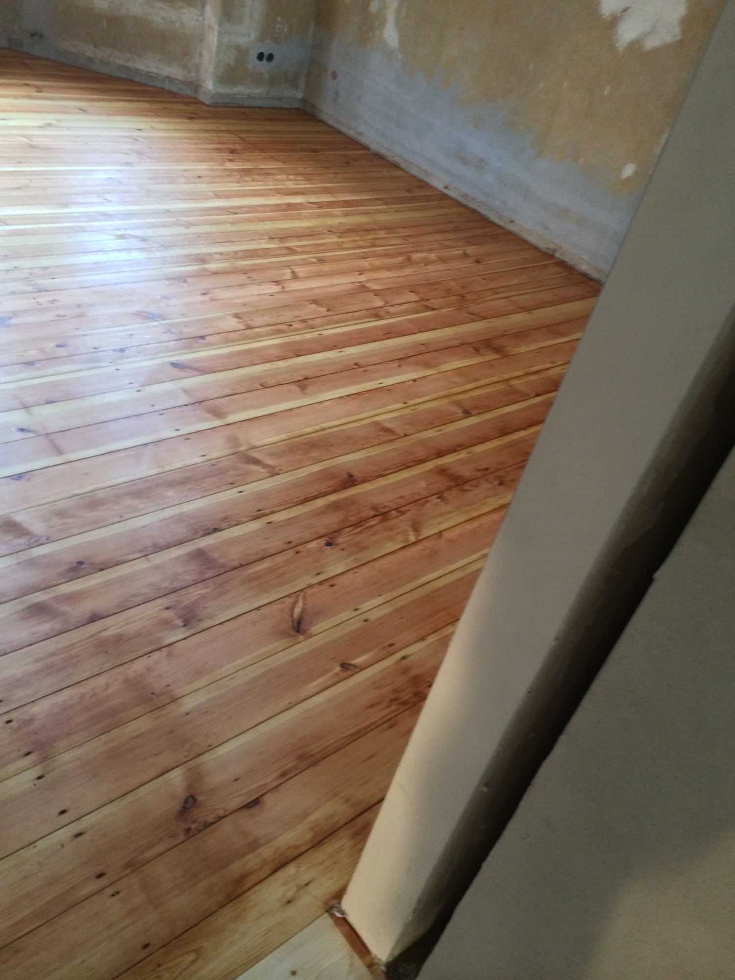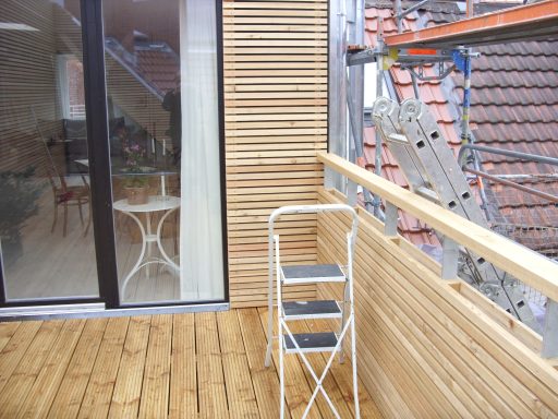 Hier haben wir die Deckenbalkensanierung im Dachgeschoss, die Fußbodenaufarbeitung im gesamten Haus und die Fassadengestaltung und Balkonbelag aus Holz ausgeführt.